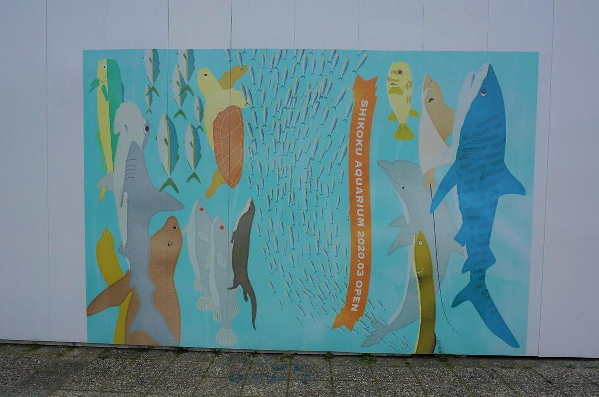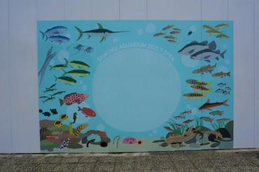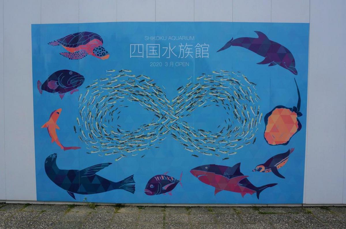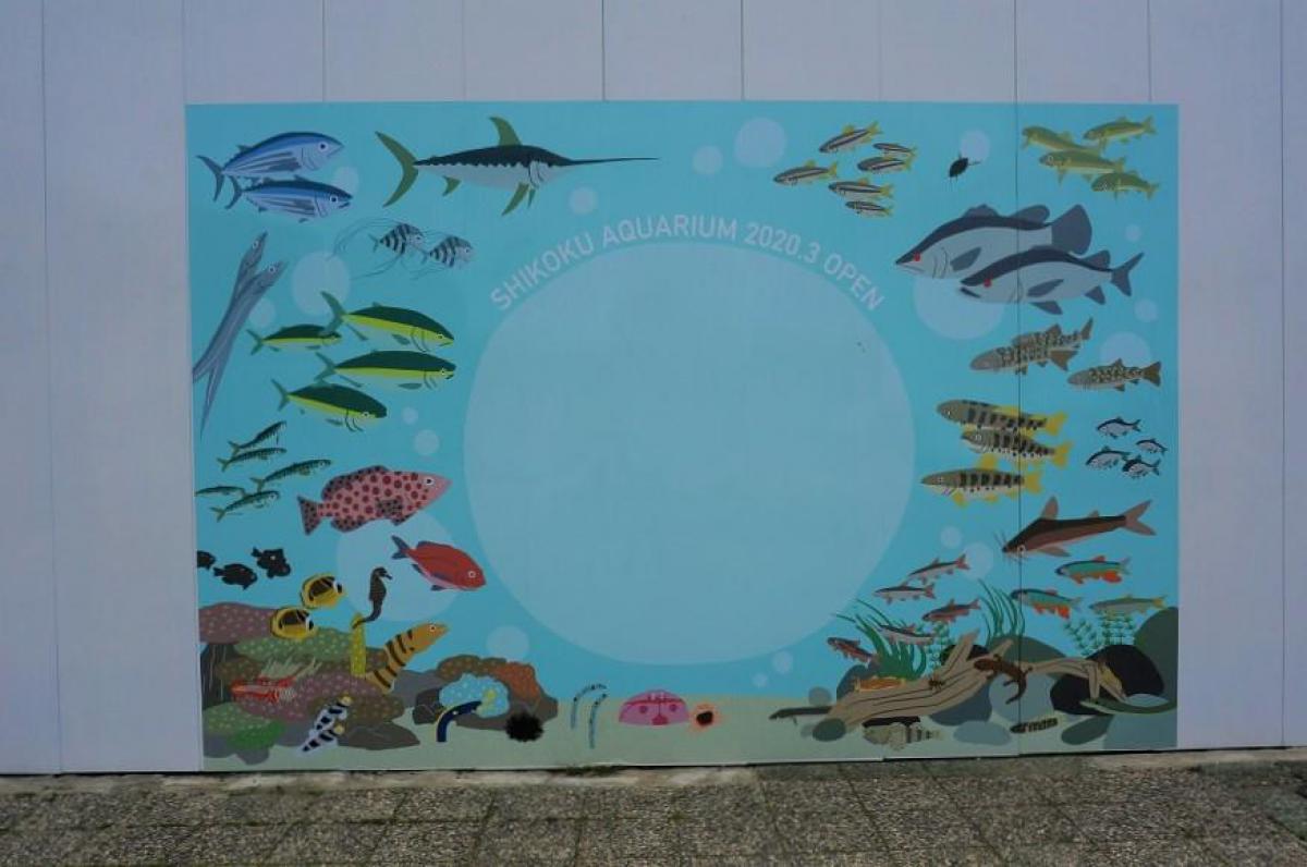 フォトスポットには、3種類のデザインがあり、四国水族館に入居予定の生きものたちのイラストが描かれています。