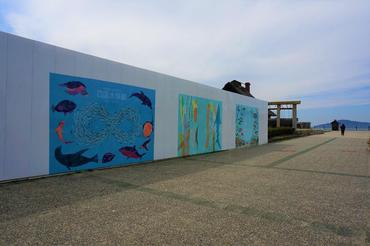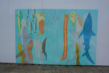 殺風景な工事現場の仮囲いが、イラストの魚たちと一緒に撮影できる“お楽しみスポット”になっていて、公園を訪れる人々を楽しませています。