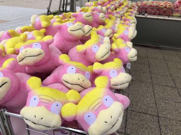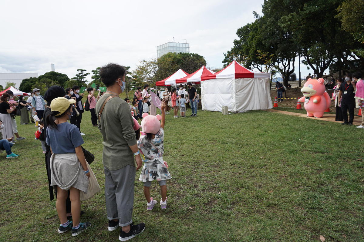 ヤドンクイズ大会やミッションゲームのほか、ポケモンセンター出張所、ヤドンカフェなど、2日間は臨海公園がヤドン一色となりました。子どもたちが揃ってヤドンのぬいぐるみを抱えている姿は、癒しの光景でした。