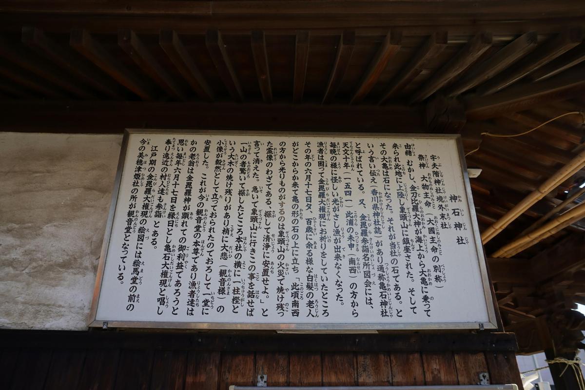 金刀比羅大神(ことひらのおおかみ)が大亀に乗ってこの地に上陸し、その亀が石となったものがこの神社の石であるという言い伝えがあり、そのため亀石神社ともいわれる。