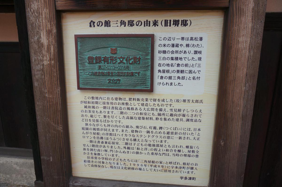 とんがり屋根がひときわ目立つ古街のシンボル的な建物で、国の登録有形文化財になっています。もとは肥料商であった堺氏の別棟で、1996年に町が購入し、改修しました。昭和初期のぜいを尽くした近代和風建築で、書院造りの様式を取り入れた和風の建物の隣に、ステンドグラスがはめられた洋館が立つ大きな邸宅からは、宇多津が繁栄した時代の様相が伝わってきます。
